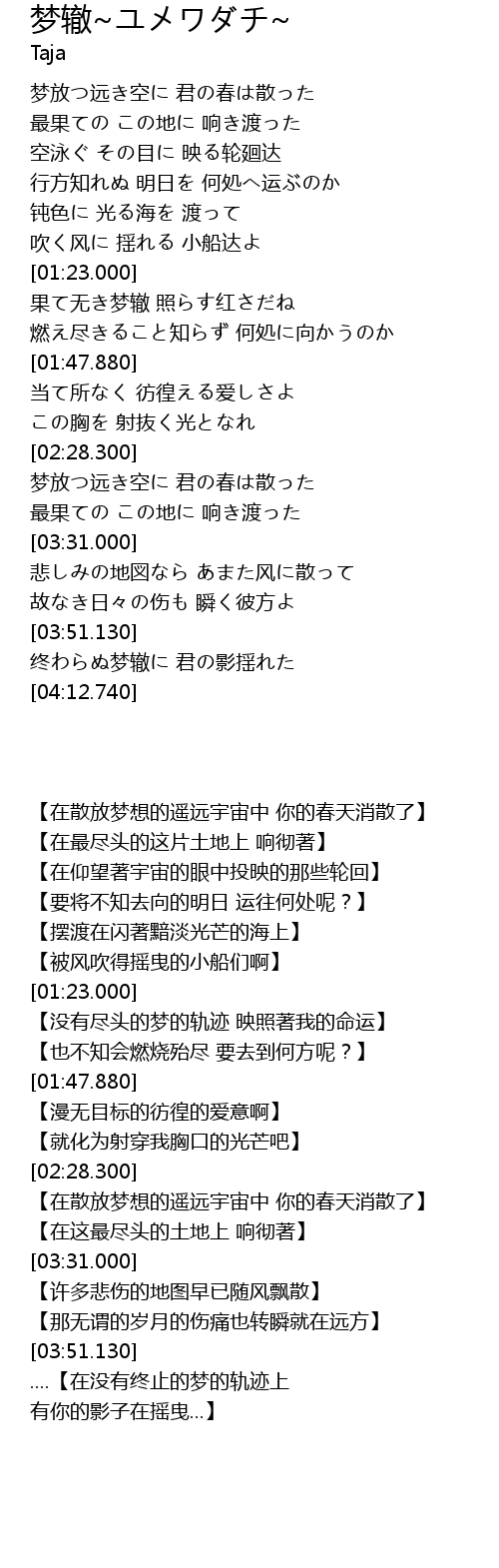 | [03:51.160] | 终わらぬ梦辙に 君の影揺れた |