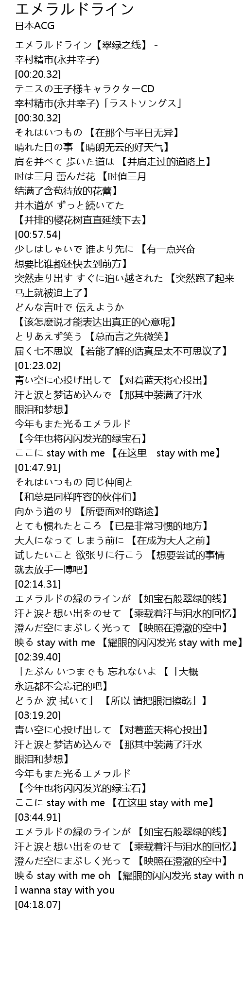 | [00:00.34] | エメラルドライン【翠绿之线】 - 幸村精市(永井幸子) |