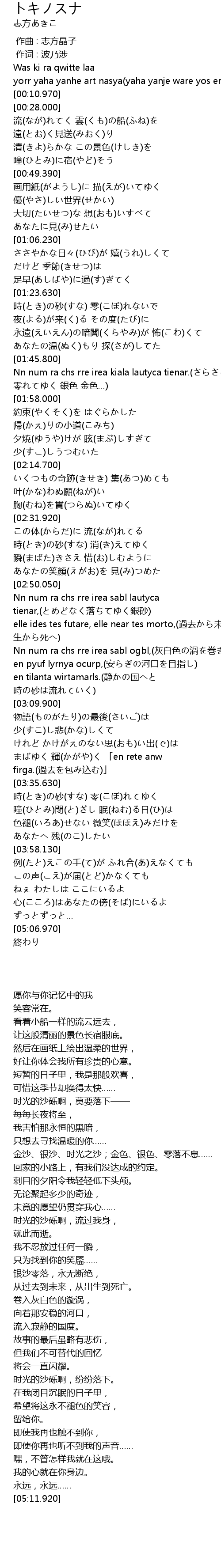 | [02:50.680] | Nn num ra chs rre irea sabl lautyca tienar,(とめどなく落ちてゆく銀砂) |