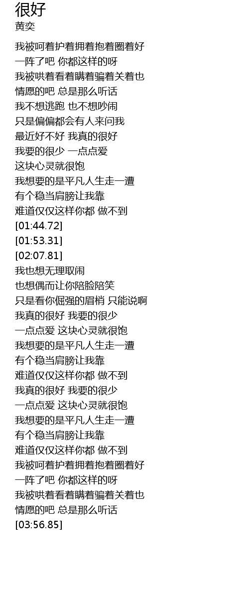 | [02:56.99] | wǒ zhēn de hěn hǎo wǒ yào de hěn shǎo |
