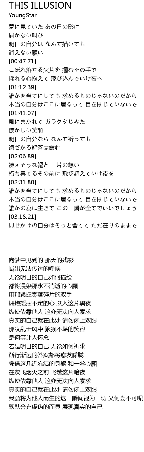 | [03:29.39] | 見せかけの自分はそっと舍てて ただ在りのままで |