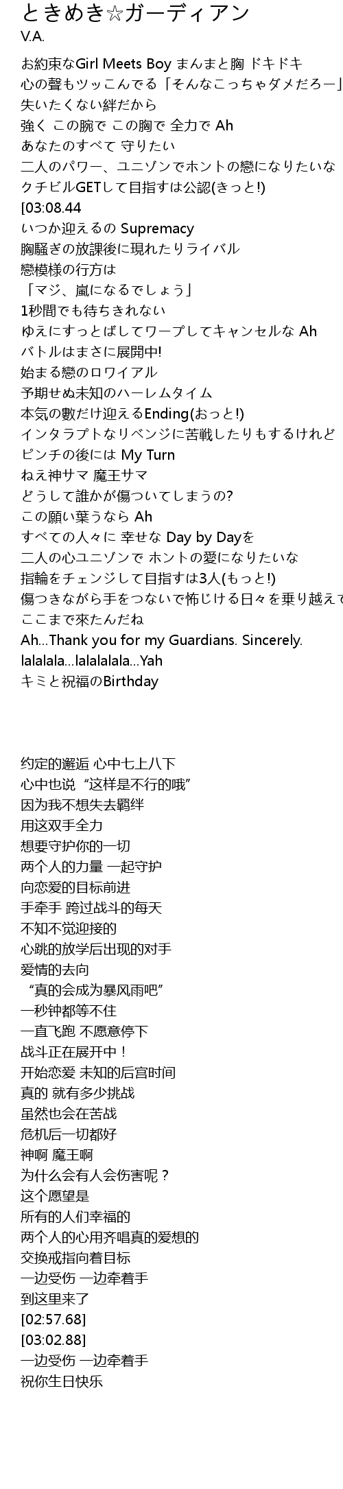 | [02:57.68] | Ah...Thank you for my Guardians. Sincerely. |