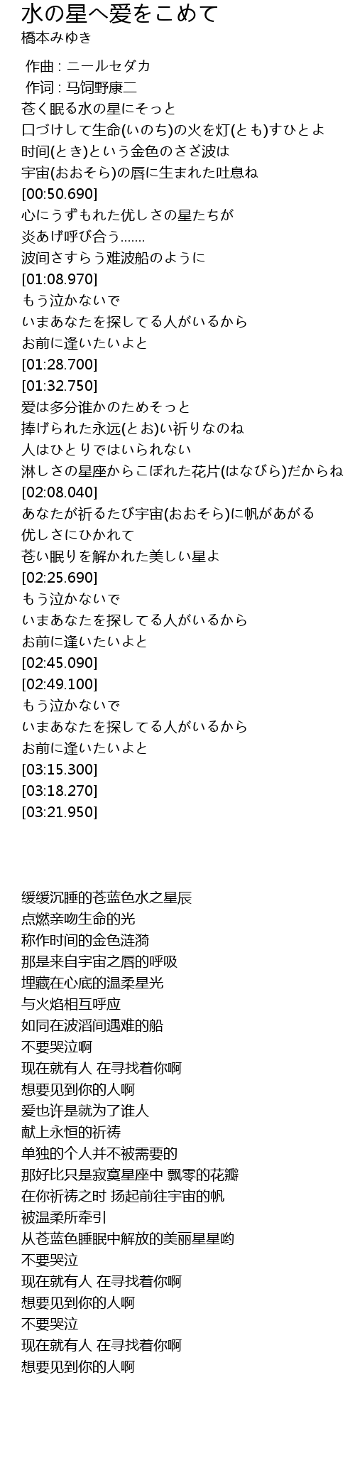 | [00:22.800] | 苍く眠る水の星にそっと |