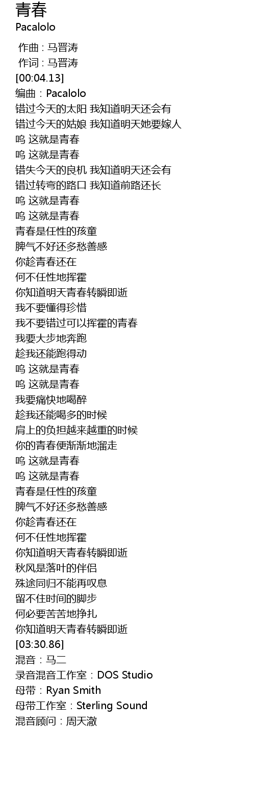 | [00:01.000] | 作词 : 马晋涛 |