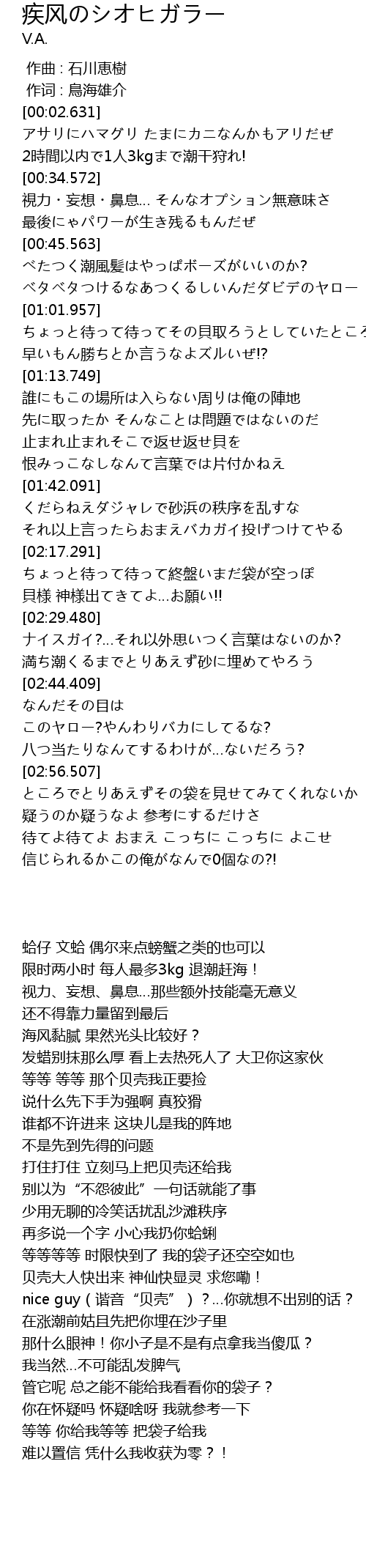| [00:20.889] | アサリにハマグリ たまにカニなんかもアリだぜ |