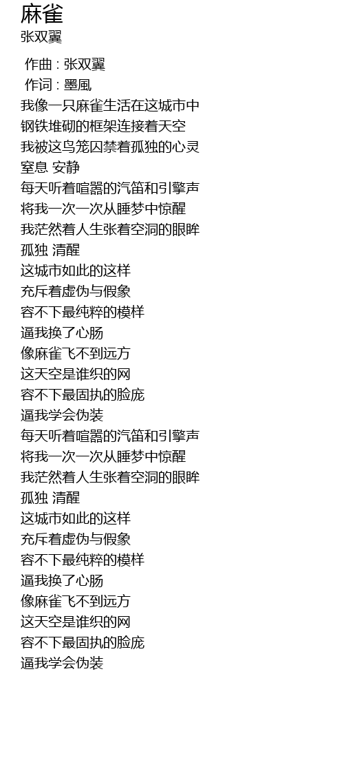 | [00:18.797] | 我像一只麻雀生活在这城市中 |