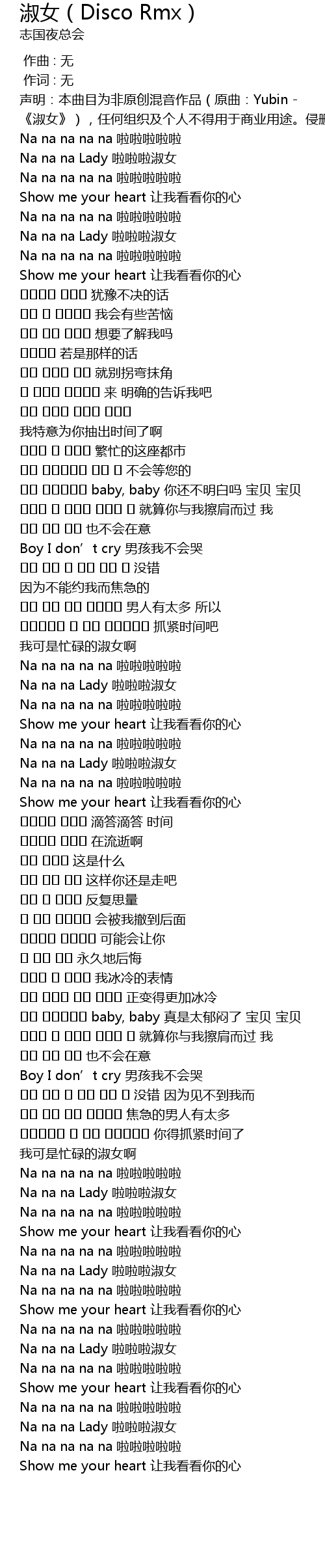 | [00:01.450] | 声明:本曲目为非原创混音作品(原曲:Yubin - 《淑女》),任何组织及个人不得用于商业用途。侵删。 |