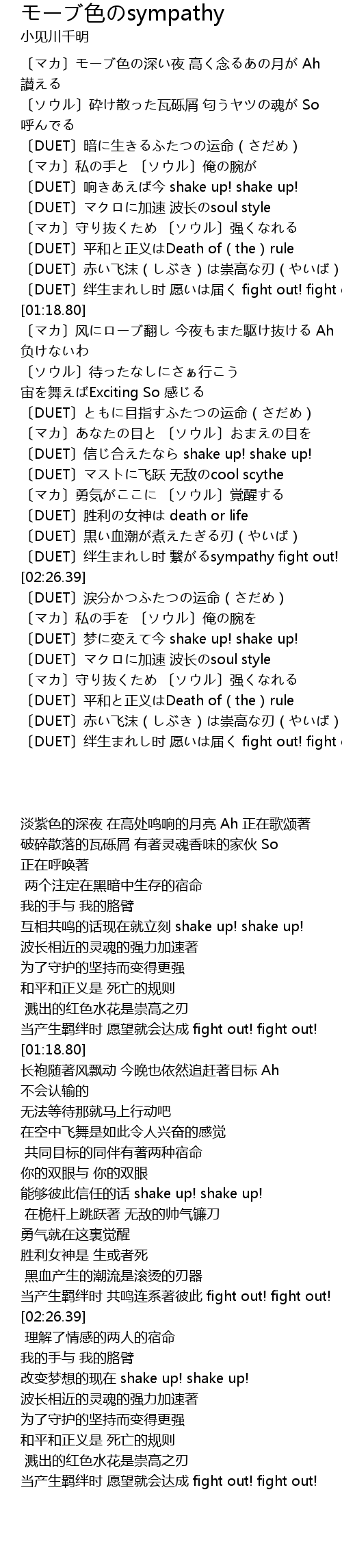 | [02:19.19] | DUET bàn shēng shí jì sympathy fight out! fight out! |