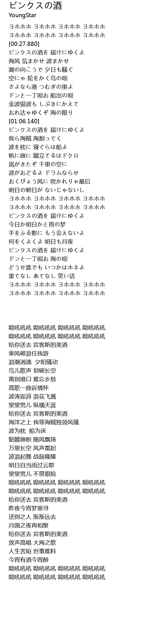 | [02:33.400] | ビンクスの酒を 届けにゆくよ |