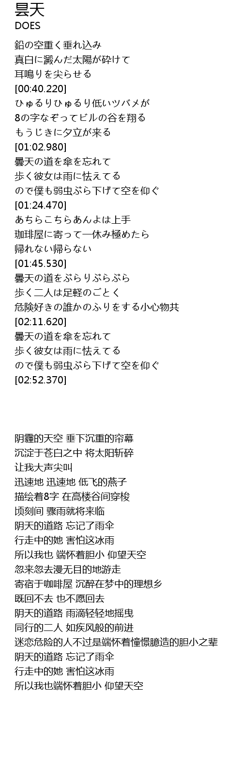 | [01:48.330] | 曇天の道をぶらりぶらぶら |
