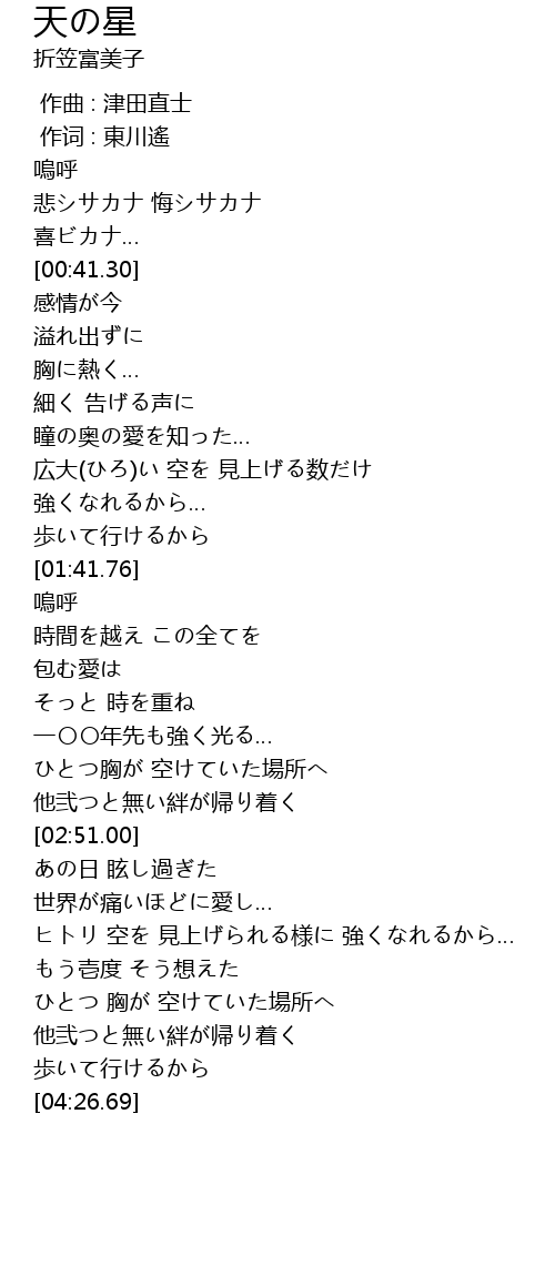 | [03:58.59] | ひとつ 胸が 空けていた場所へ |