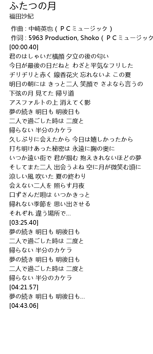 | [02:36.69] | そしてまた二人 出会うよね 空に月が微笑む頃に |