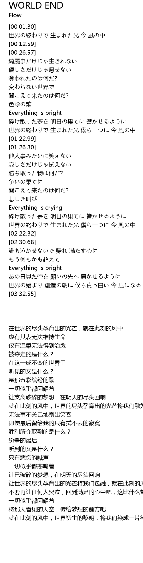 | [00:02.60] | 世界の終わりで 生まれた光 今 風の中 |