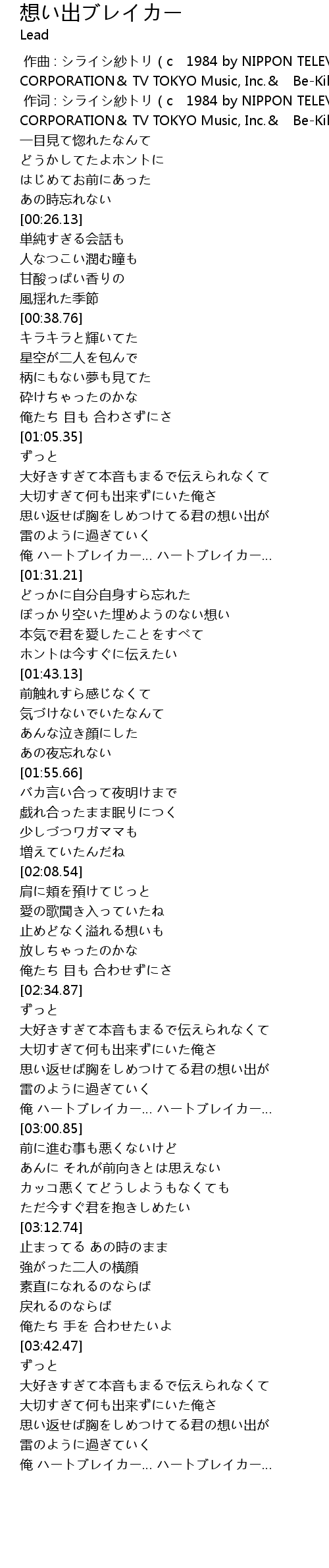 | [00:01.000] | zuò cí : shā c 1984 by NIPPON TELEVISION MUSIC CORPORATION TV TOKYO Music, Inc. BeKikakushitsu, Inc. |