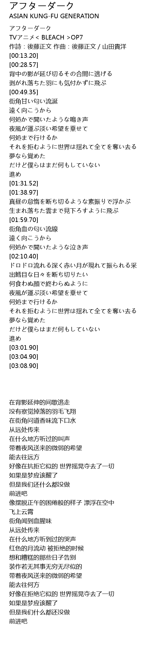 | [00:07.20] | 作詩:後藤正文 作曲:後藤正文/山田貴洋 |