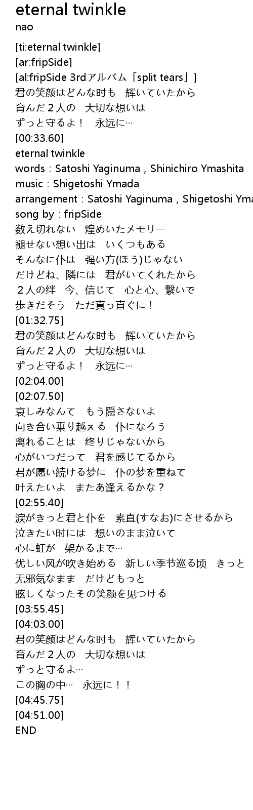 | [02:55.55] | 涙がきっと君と仆を 素直(すなお)にさせるから |