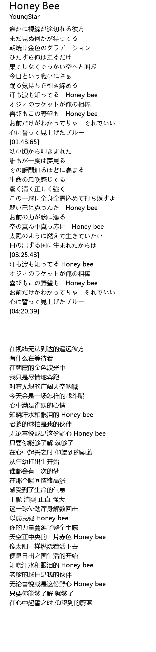 | [03:41.43] | 汗も涙も知ってる Honey bee |