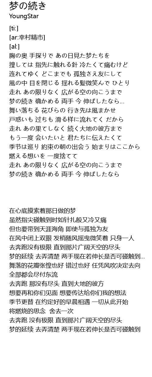 | [03:11.43] | 梦の続き 确かめる 両手 今 伸ばしたなら |