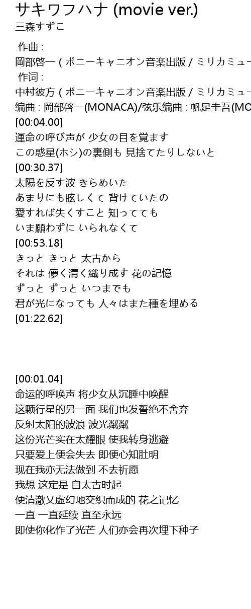 | [00:01.04] | 编曲 : 岡部啓一(MONACA)/弦乐编曲 : 帆足圭吾(MONACA) |