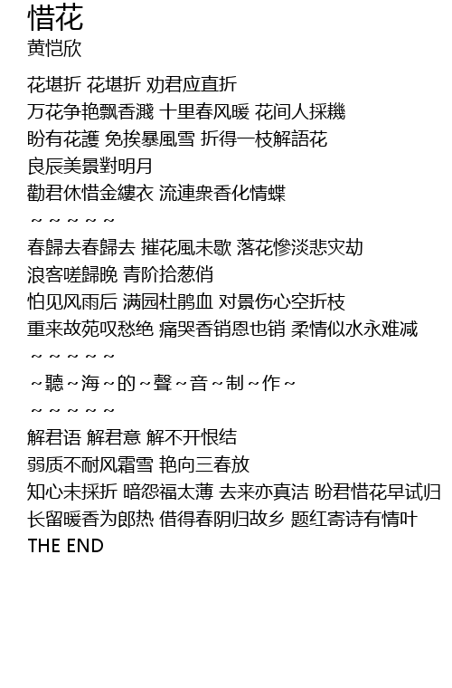 | [02:18.64] | 知心未採折 暗怨福太薄 去来亦真洁 盼君惜花早试归 |
