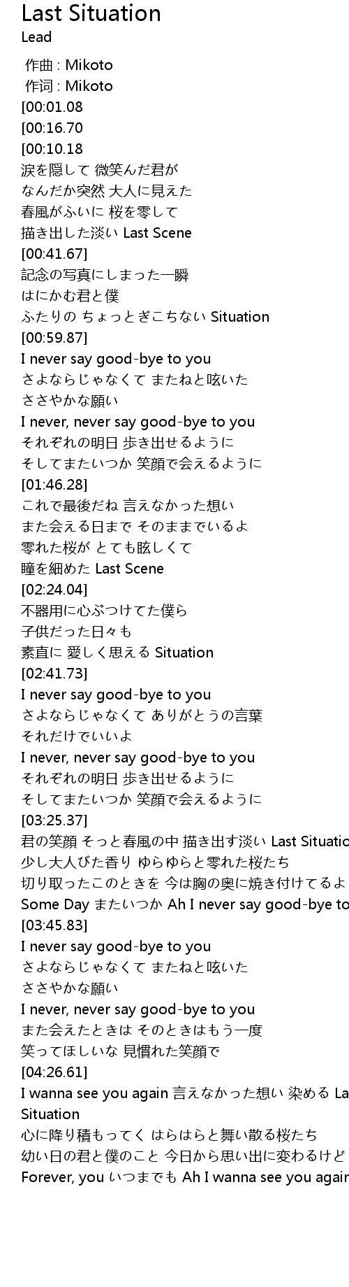 | [00:11.43][00:01.08] | I never say good-bye to you |