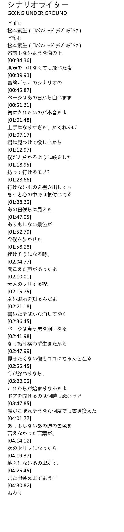 | [00:01.000] | 作词 : 松本素生(㈲アクアミュージックプロダクツ) |