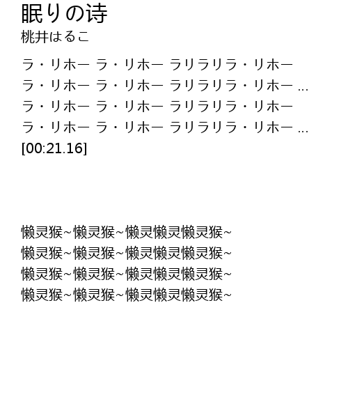 | [00:16.13] | ラ・リホー ラ・リホー ラリラリラ・リホー … |
