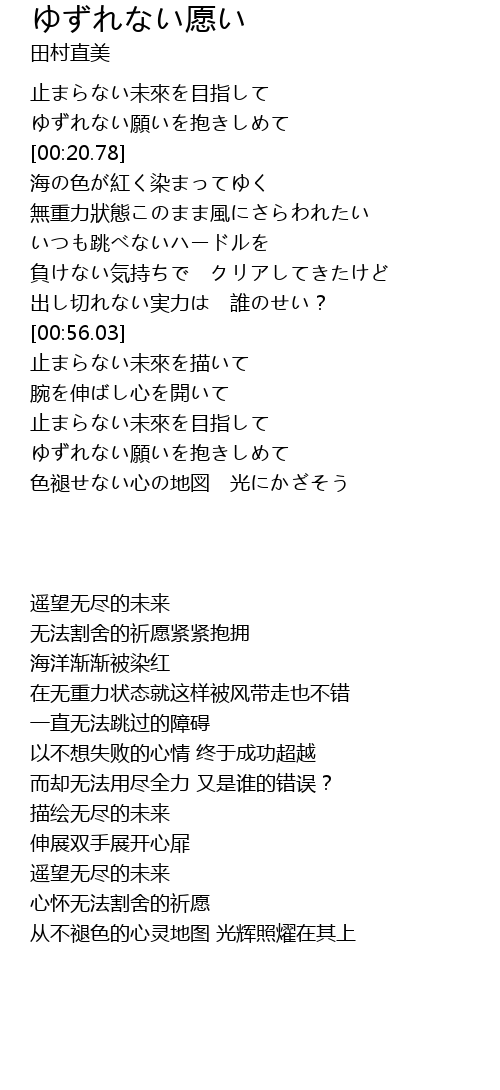 | [01:17.74] | ゆずれない願いを抱きしめて |