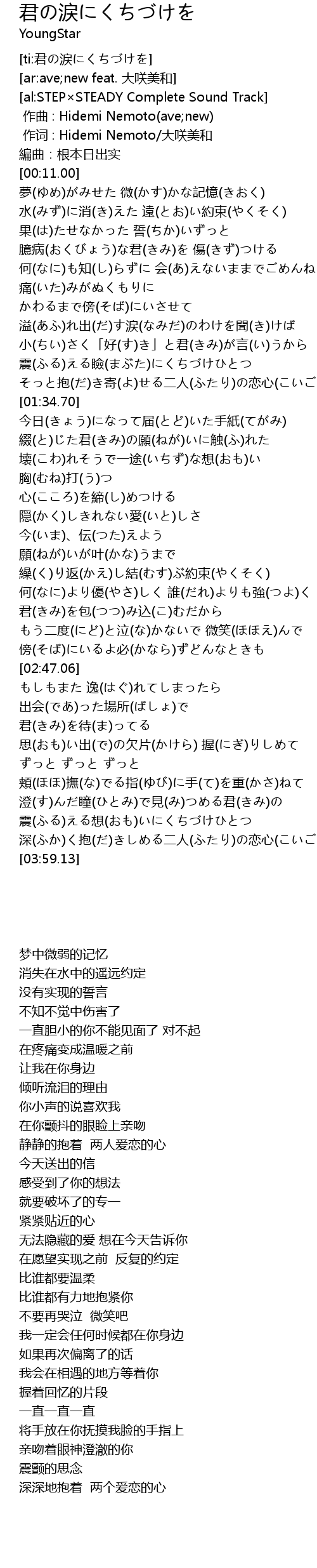 | [00:01.00] | 作词 : Hidemi Nemoto/大咲美和 |