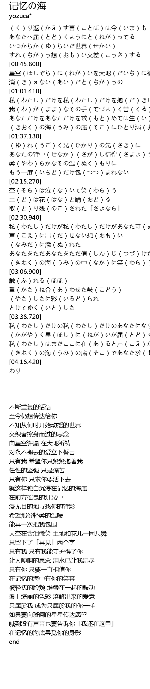 | [04:06.570] | (きおく)の海(うみ)の底(そこ)であなた求(もと)めている |