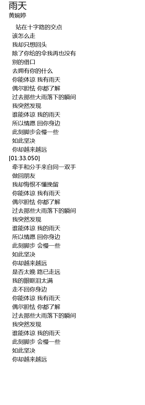 | [02:25.470] | 谁能体谅 我的雨天 |