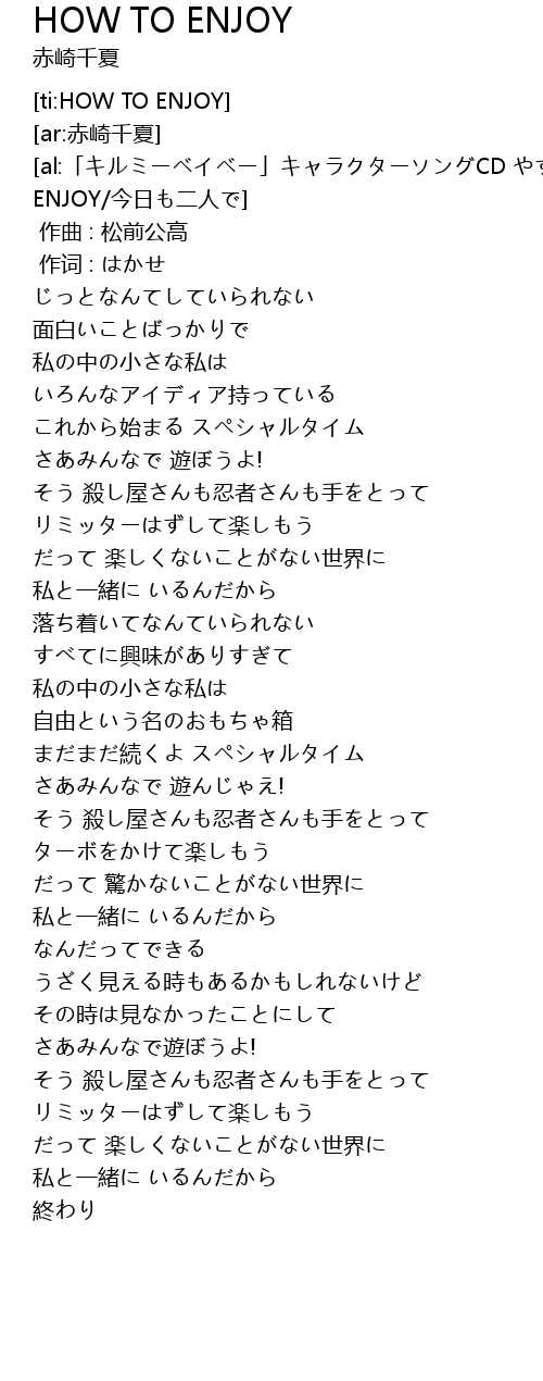 | [al:「キルミーベイベー」キャラクターソングCD やすな HOW TO ENJOY/今日も二人で] | |