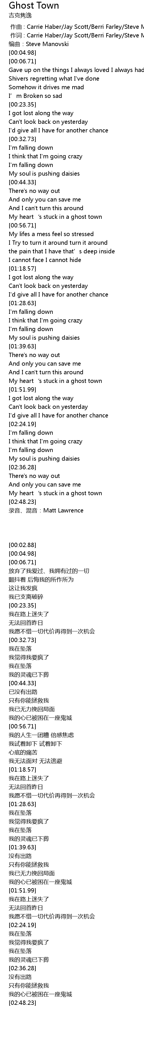 | [00:53.41] | My heart' s stuck in a ghost town |