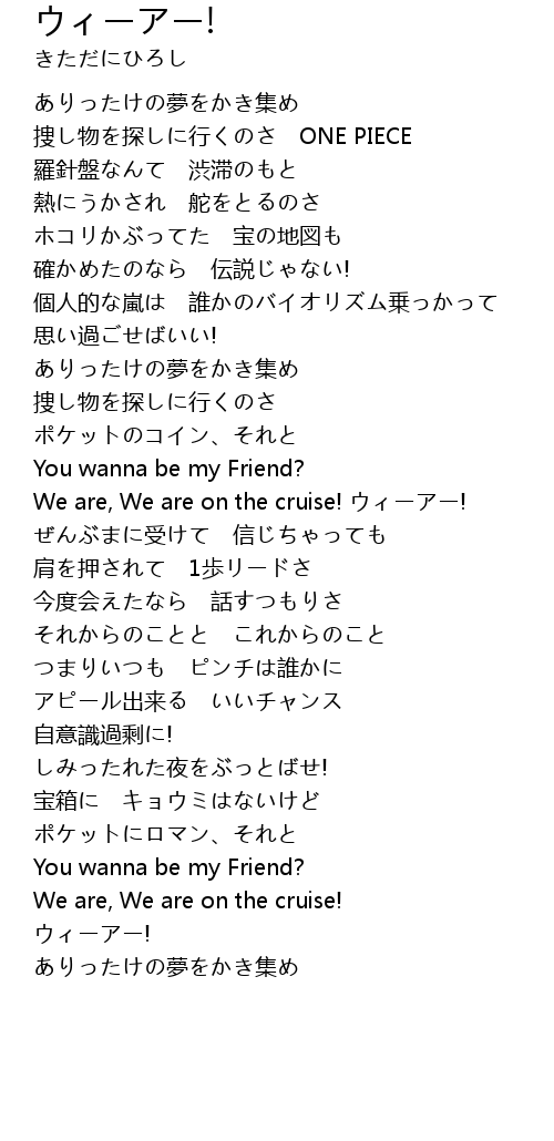 | [00:36.89] | 捜し物を探しに行くのさ ONE PIECE |