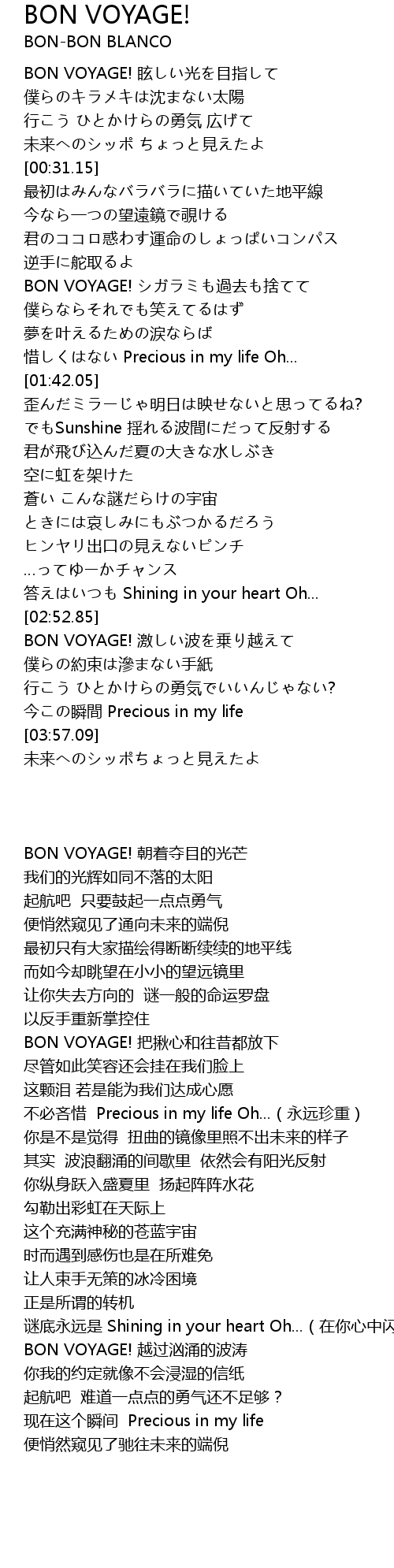 | [03:28.98] | BON VOYAGE! ji bo cheng yue |