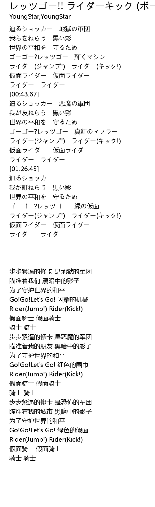 | [00:29.18] | ライダー(ジャンプ!) ライダー(キック!) |