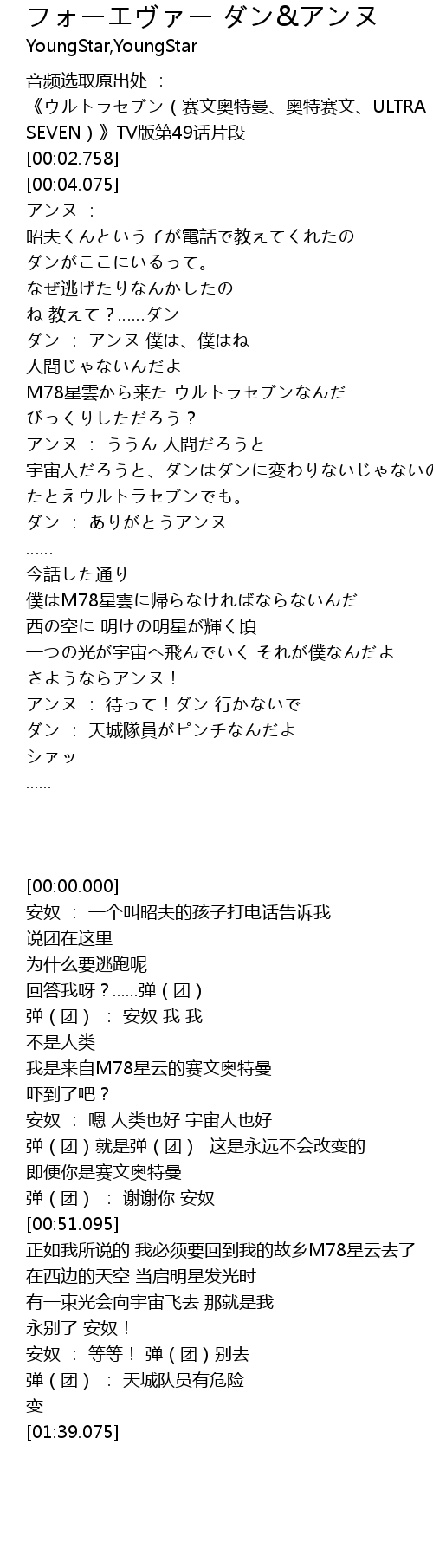 | [00:00.000] | 音频选取原出处 : 《ウルトラセブン(赛文奥特曼、奥特赛文、ULTRA SEVEN)》TV版第49话片段 |