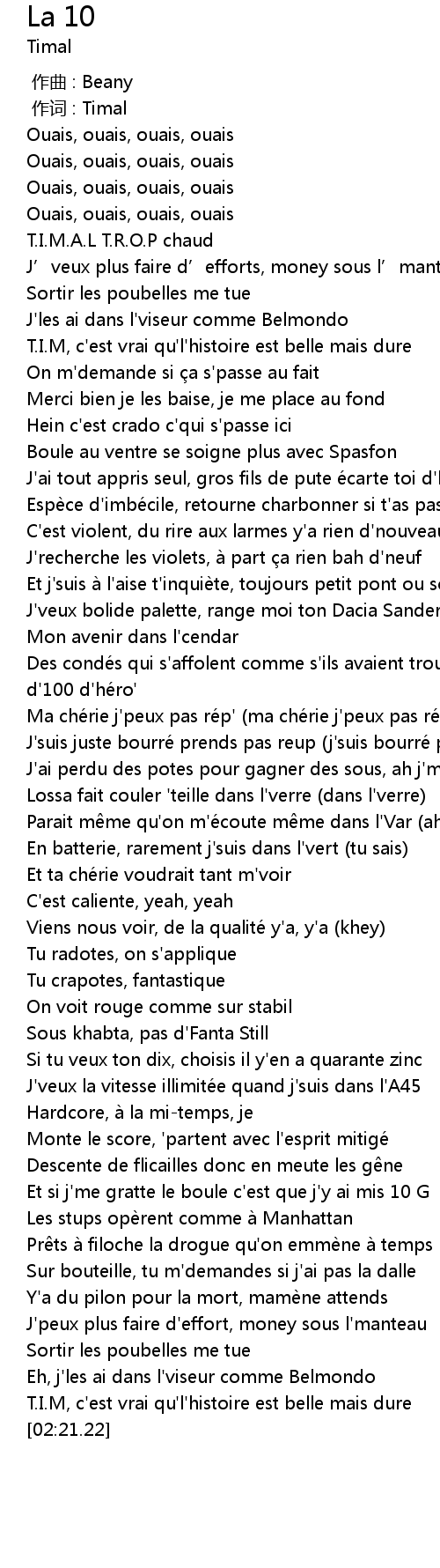 | [01:40.15] | Si tu veux ton dix, choisis il y' en a quarante zinc |