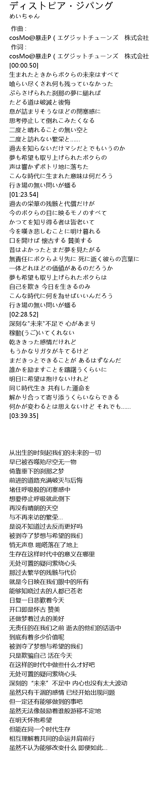 | [00:00.016] | 作词 : cosMo@暴走P(エグジットチューンズ 株式会社 クリエイター支援事業部) |