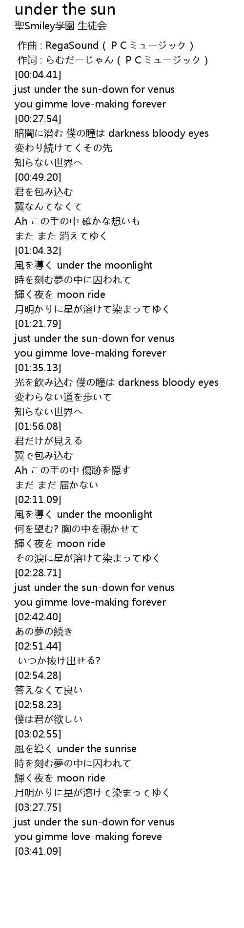| [03:21.19] | 月明かりに星が溶けて染まってゆく |
