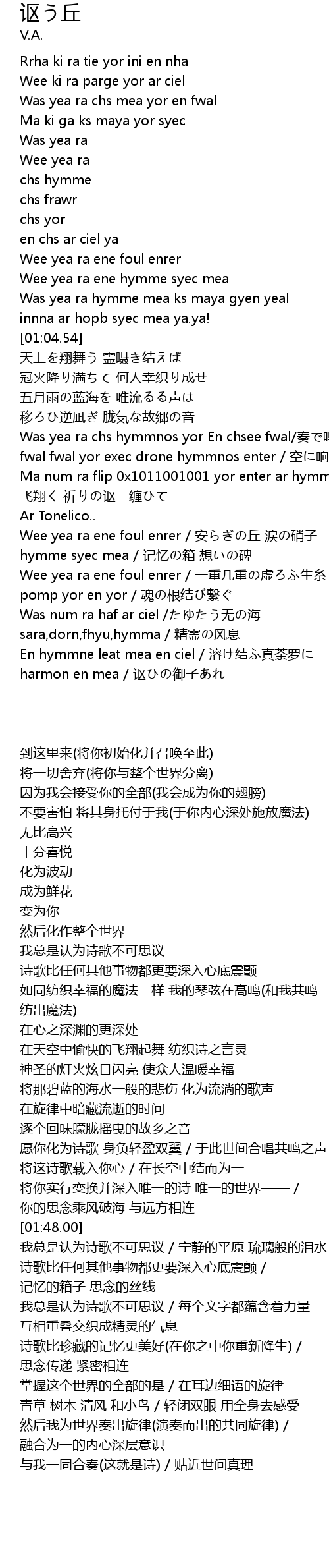 | [01:35.38] | Was yea ra chs hymmnos yor En chsee fwal/奏で鸣り吹く凯亜 |