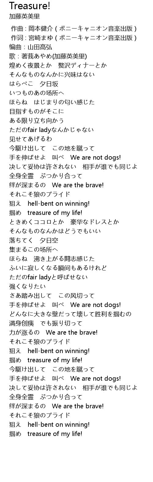 | [00:47.37] | 手を伸ばせよ 叫べ We are not dogs! |