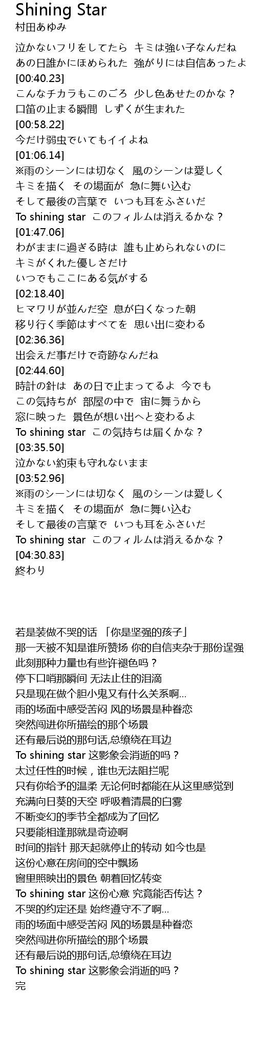 | [04:20.64] | To shining star このフィルムは消えるかな? |