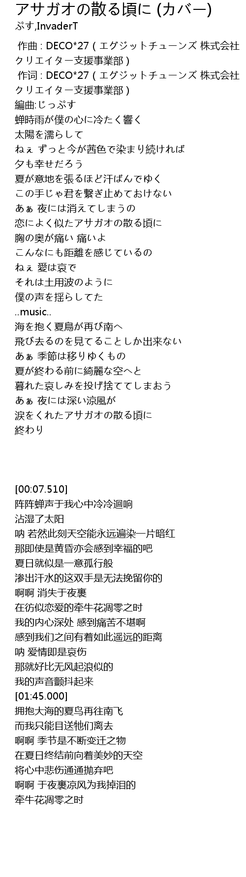 | [00:59.030] | 恋によく似たアサガオの散る頃に |