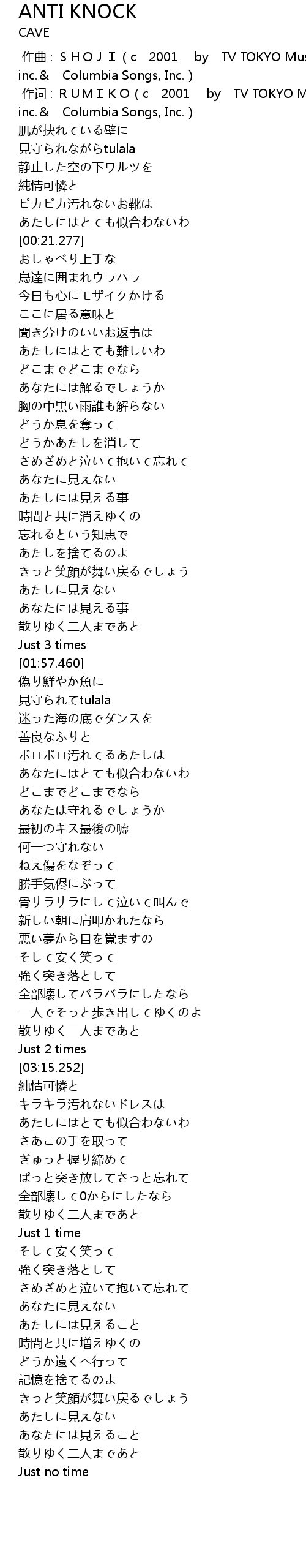 | [00:00.126] | zuò cí : c 2001 by TV TOKYO Music, inc. Columbia Songs, Inc. |