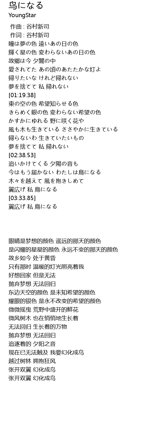 | [03:25.78] | 翼広げ 私 鳥になる |