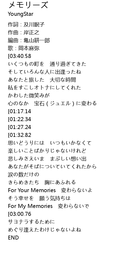 | [03:41.96][01:17.14] | For Your Memories 見つめてるよ |