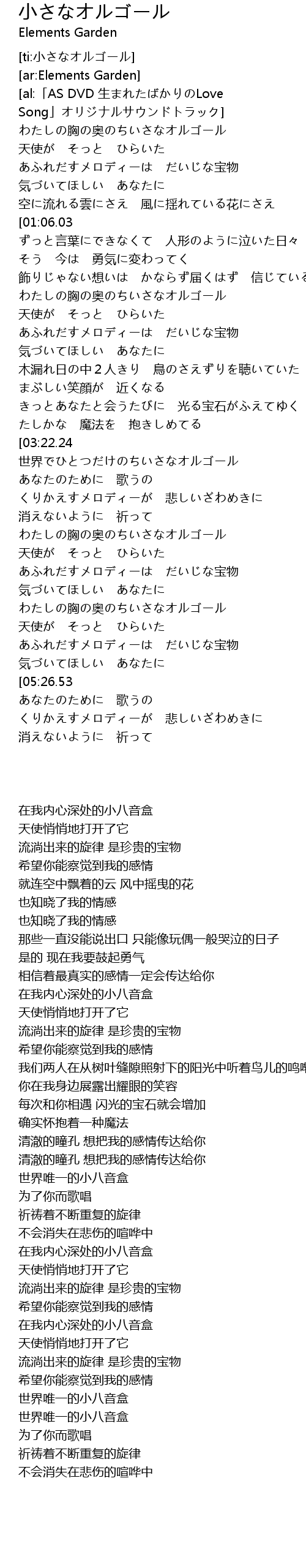 | [05:19.56][05:26.53] | 世界でひとつだけのちいさなオルゴール |