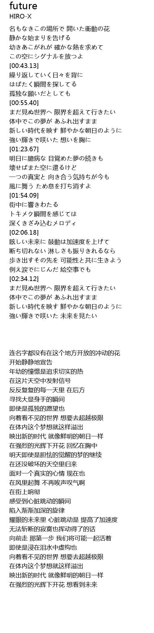 | [02:58.84] | まだ見ぬ世界へ 限界を超えて行きたい |