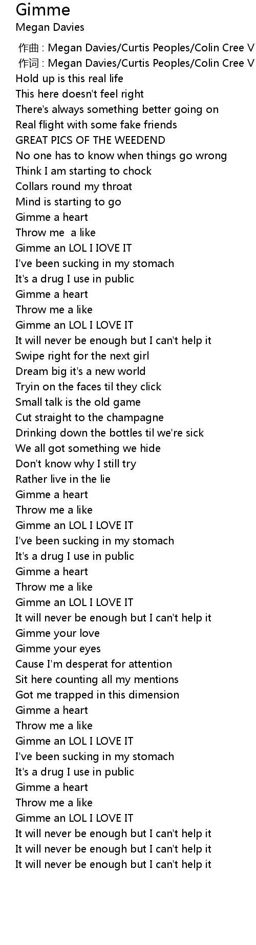 | [00:01.000] | 作词 : Megan Davies/Curtis Peoples/Colin Cree V |